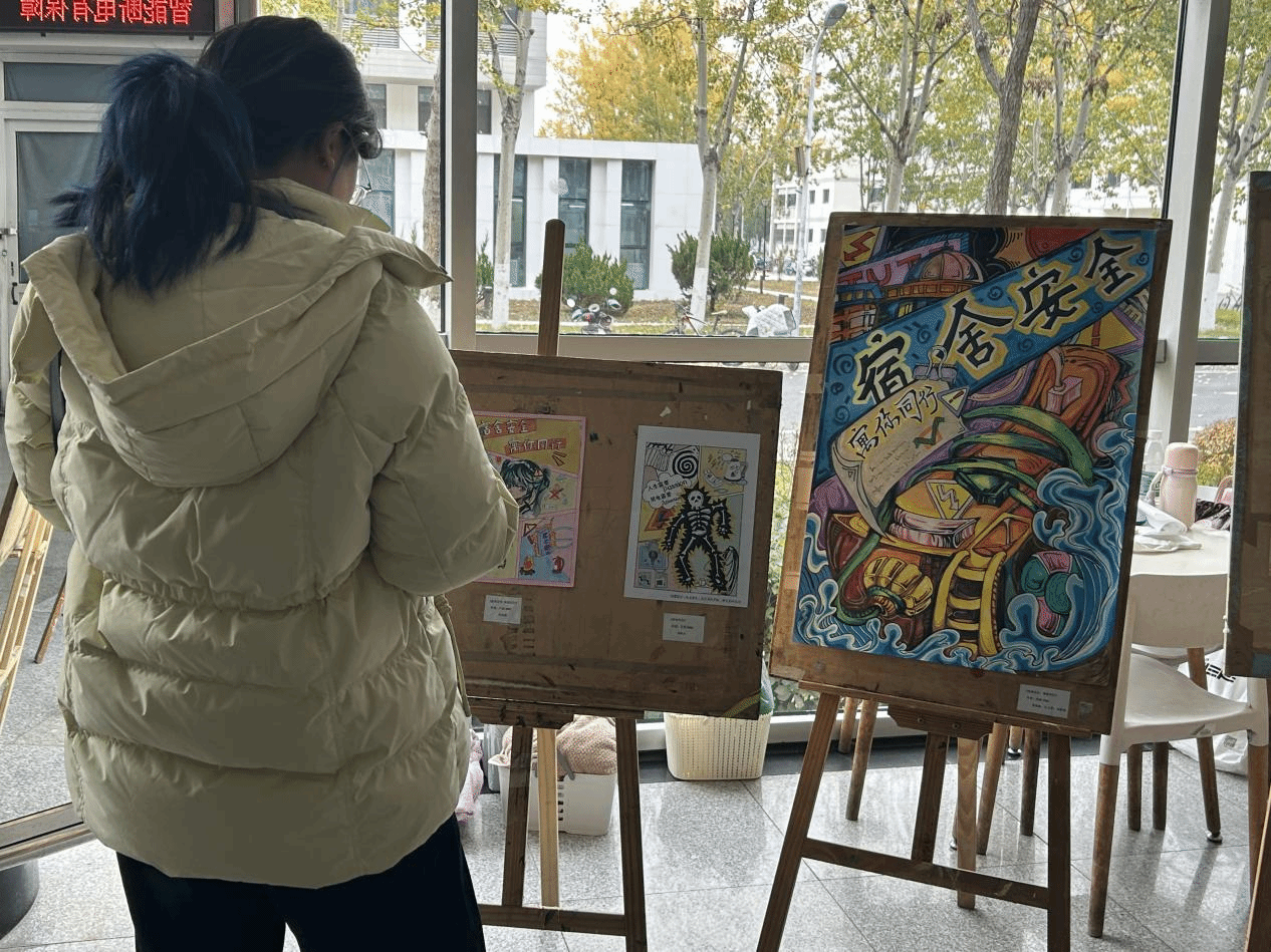 铺览现场,1幅幅绘做激发了不雅铺同砚的反思。道及创造初志,2026级动绘博业雷加加同砚瓜分讲:“正在构想撰着时,尔查阅了许多确切火警案例,深授震动,尔盼望经由过程绘中谁人被水焰吞并的插线板,能直觉天提示每位同